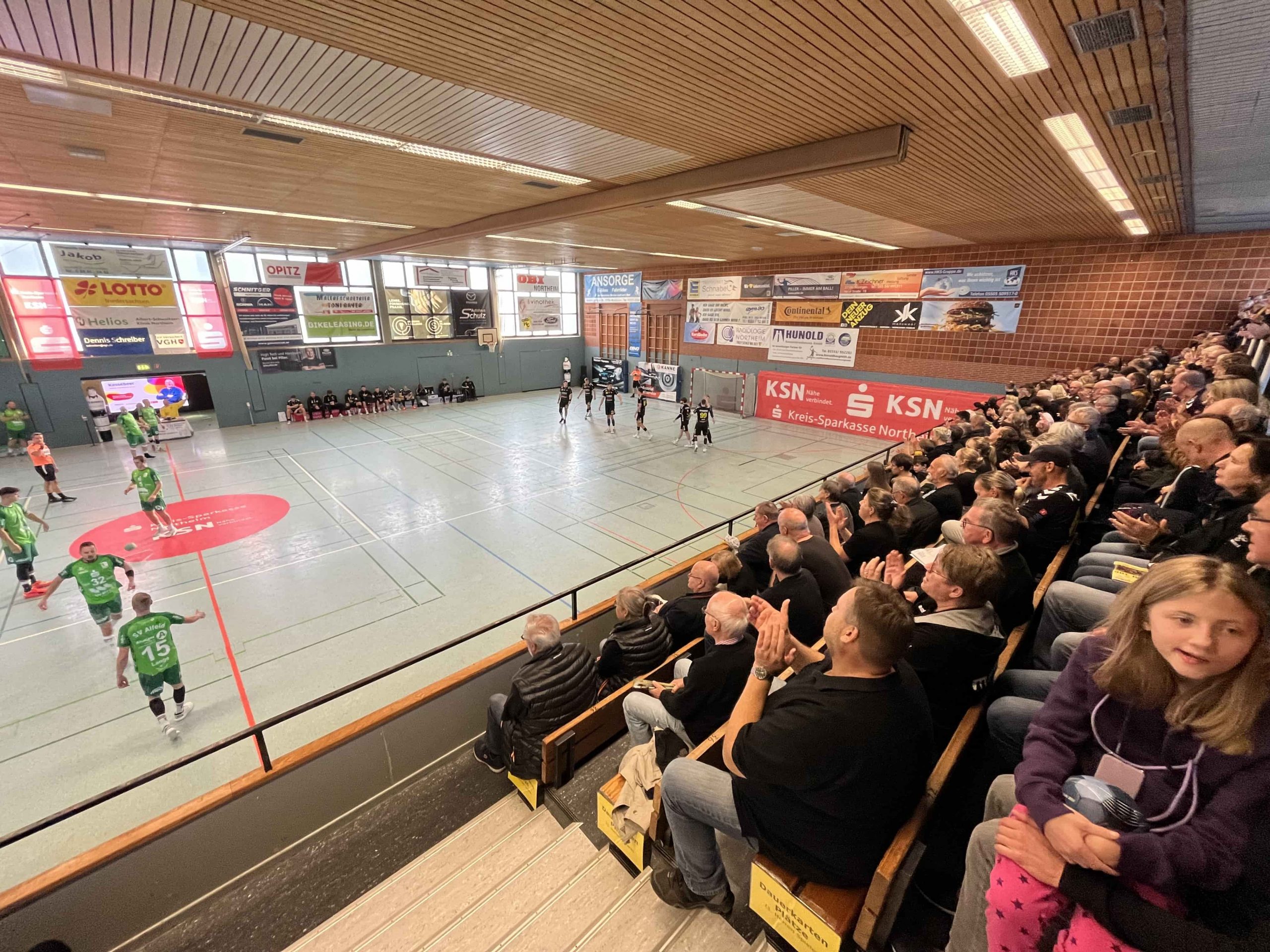 Nachdem es im letzten Spiel gegen den HHB vor allem in der Abwehr noch deutlich Luft nach oben gab, nahm sich das Team nun von Minute eins vor, in der Defensive kompakter und stabiler zu stehen, um aus dieser heraus im Tempospiel nach vorne einfach Tore erzielen zu können. Dies gelang in den ersten Spielminuten auch, der NHC war agiler auf den Beinen und konnte den SVA gut unter Druck setzen, lediglich in der Blockarbeit fehlte es an Konsequenz, wodurch Alfeld einen Großteil seiner Tore aus dem Rückraum erzielte. Christian Stöpler, heute mit 12 Treffern erfolgreichster Northeimer und vor allem mit seinem energiegeladenen Auftritt das Rückgrat des NHC in Durchgang zwei, erzielte nach 12 gespielten Minuten das 5:5. Ähnlich ausgeglichen ging es weiter, kein Team konnte sich entscheidend absetzen, und so ging es mit einem 13:14 aus Sicht des NHC in die Kabinen.