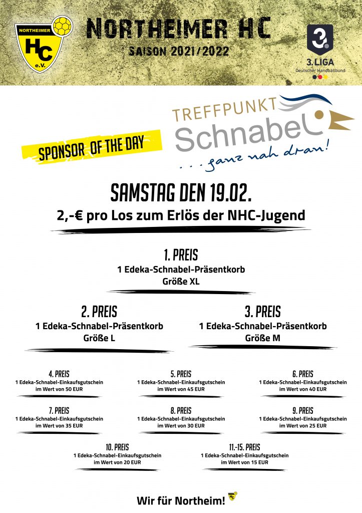 Spieltagssponsor ist der Treffpunkt Schnabel. Tobias Schnabel und sein Team stellen dem NHC neben drei großen Präsentkörben auch 12 Einkaufsgutscheine von 15€ bis 50€ für eine Verlosung zur Verfügung. Lose können vor Ort für 2€ erworben werden. Der Erlös geht in die Nachwuchsarbeit des NHC .