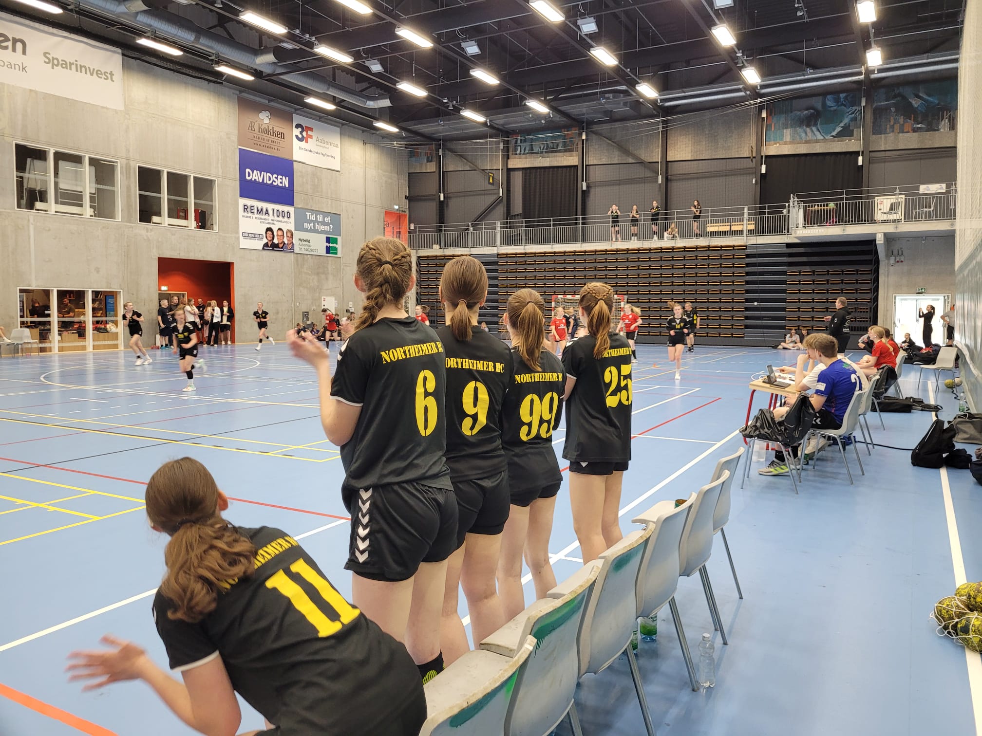 Die Hinfahrt begann sehr mühsam. 5 Stunden benötigten wir bis nach Hamburg (allein 1 ½ Stunden von Northeim bis nach Seesen). Immer wieder stockte oder staute sich der Verkehr. Hinter Hamburg war dann aber die Strecke frei. So kamen wir nach achtstündiger Fahrt (ursprünglich geplant waren maximal fünf Stunden) endlich in Aabenraa an, wo wir sogleich in die Schule eincheckten, die uns fortan für die nächsten zwei Nächte als Unterkunft dienen sollte. Dort fielen wir müde ins Bett, denn auch eine Autofahrt und ständiges Sitzen kann anstrengend sein. Zudem ging es am nächsten Tag bereits früh raus. Das Trainerteam testete die mitgebrachte Musikanlage als Weckdienst bereits um 6:30 Uhr. Danach ging es in die Arena und nach einem „Frühstück“ ging es schließlich um 09:30 Uhr mit den Spielen los. In unserer Vorrundengruppe waren ein weiteres deutsches Team (HSG Kalkberg 1) sowie zwei dänische Teams (Galten FS 2 sowie Rødekro-Aabenraa Håndbold 1) und das niederländische Team Veneco Velo 2. Letztere Mannschaft stand uns auch als erster Gegner gegenüber und das direkt vor einigermaßen gefüllten Rängen. So sah man den Mädels die Aufregung wahrlich an, war doch die Atmosphäre schon überwältigend. Aber auch die Trainer staunen immer wieder, wenn sie in Dänemark Turniere besuchen: Der Arenakomplex, wo das Turnier stattfand, bestand aus 6 Handballfeldern, einem Schwimmbad (inkl. Rutsche, Whirlpool, 3m-Turm und mehrere Saunen) sowie einem frei zugänglichen Fitnesscenter. Aber genug vom Schwärmen der Trainer. Zurück zum Turnier: Gegen Veneco Velo erwischten wir einen guten Start ins Turnier. Konzentriert gingen wir zu Werke. Beherzt wurde in der Abwehr zugefasst, die Außen konnten immer wieder Bälle stehlen und vorne erspielten wir uns auch im Positionsangriff gute Chancen. Sehr positiv fiel auf, wie wenig Probleme wir mit der Patte hatten. Der Ball lief äußerst flüssig und wir hatten kaum technische Fehler vorzuweisen. Lange Zeit führten wir, doch dann verloren wir den Faden und lagen zwei Minuten vor Ende mit zwei Toren hinten. Doch die Mädels gaben sich nicht auf und konnten noch ausgleichen. Kurz vor Ende hatten wir dann sogar nochmal Ballbesitz, konnten aber auch durch den letzten Freiwurf nach Ablauf der Spielzeit den Ball im Tor der Niederländerinnen nicht mehr unterbringen. So endete das erste Spiel mit einem Unentschieden (10:10). Im zweiten Spiel trafen wir auf den späteren Turnierzweiten: Rødekro-Aabenraa Håndbold 1, die die Jugendmannschaft von Sønderjyske F, die in die erste dänische Liga in der letzten Damensaison aufstieg, ist. Zudem sind das Spielerinnen eines Handballinternats, die vielfach Training in der Woche haben. Entsprechend chancenlos gestaltete sich das Spiel und wir verloren 6:18. Aber das war überhaupt kein Problem, denn es war klar, dass wir hier nicht alle Spiele gewinnen konnten. Gemäß unseren Möglichkeiten zeigten wir eine gelungene handballerische Leistung. Was allerdings überhaupt nicht gelungen war, war die Spannung und die Feierei. So rief das Trainerteam dazu auf mit mehr Spannung und Fokus in die nächsten Spiele zu gehen und v.a. sich zu feiern. Das setzten die Mädchen um! Und wie!