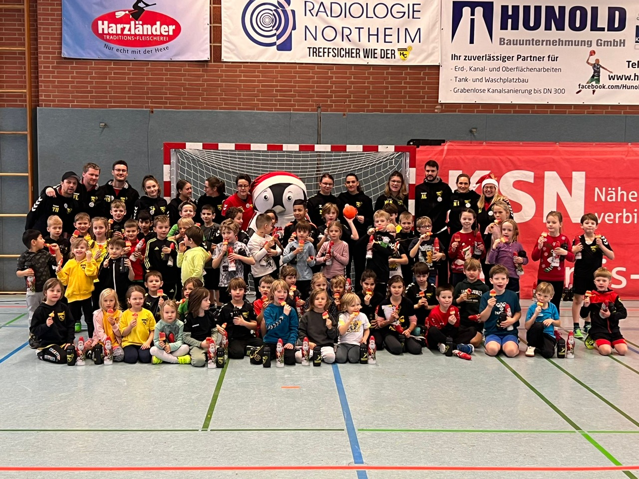 Zusätzlich gab es eine Tattoo-Station mit weihnachtlichen Motiven und eine Eltern-Challenge. Gesucht wurde das Elternteil mit dem härtesten Wurf. Musikalisch untermalt mit Weihnachtsmusik machten sich die knapp 100 Kinder daran die Aufgaben zu erfüllen. Natürlich durfte auch eine kleine Stärkung in Form von Donuts, Brezeln und natürlich viel Obst von unserem Sponsor FRUCHTHOF NORTHEIM nicht fehlen (DANKE). Um halb 12 versammelten sich alle Kinder und Eltern zum Abschluss wieder in der Halle. Die Augen wurden groß als plötzlich Balduin, das Maskotchen des HVNB mit einem Einkaufswagen voller Eis in die Halle marschierte. Als kleines Weihnachtsgeschenk verteilte Balduin zudem an alle aktiven Kinder eine Trinkflasche mit NHC-Logo von unserem Sponsor FRECKMANN und einen großen Schoko-Weihnachtsmann von unserem Sponsor EDEKA SCHNABEL. Wir danken euch für die gelungene Überraschung!!